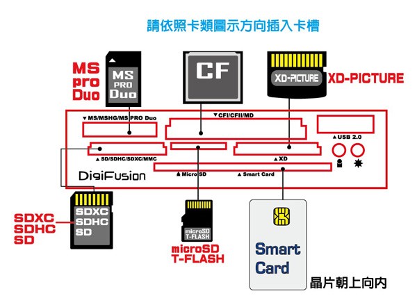 SD / MS / XD / CF / micro SD / SMART Card / USB2.0 HUB 1埠 |